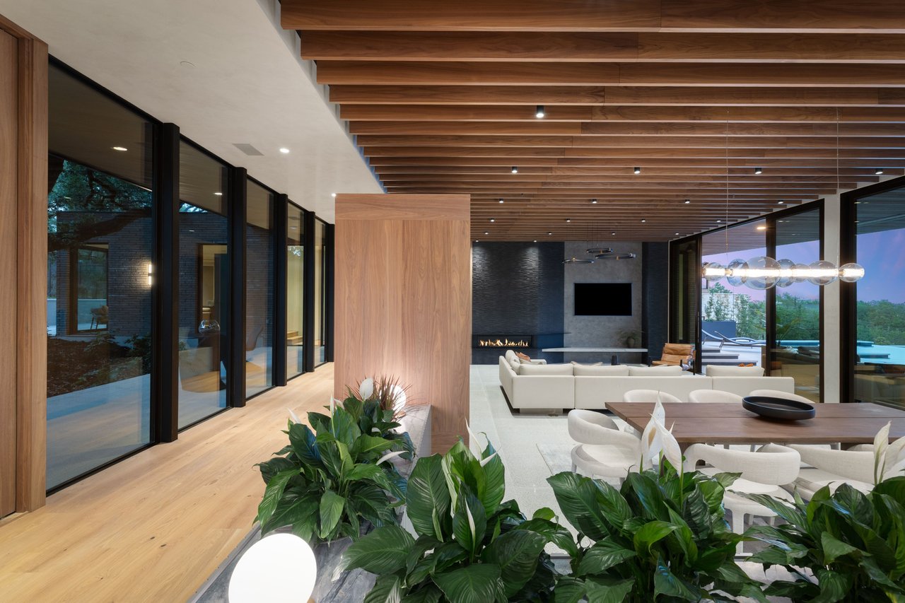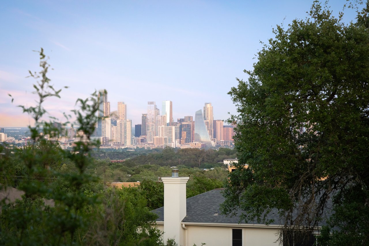 Tucked at the end of a serene and ultra-private cul-de-sac in Westlake, 1740 Camp Craft Road is a newly completed, highly customized contemporary residence that blends striking modern architecture with a warm, organic sensibility. Architecture by CoXist Studio and designed and built by Next Custom Homes, the property is thoughtfully positioned around a majestic heritage oak, creating a truly iconic arrival. A landscaped motor court and gated driveway set the tone for privacy and security, while expansive walls of glass frame breathtaking treetop views with coveted Downtown Austin vistas—most notably captured from the primary suite. Despite its peaceful, secluded setting, the home enjoys rare proximity, just moments and even walkable, to the Barton Creek Greenbelt and Sculpture Falls.