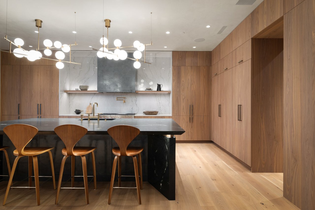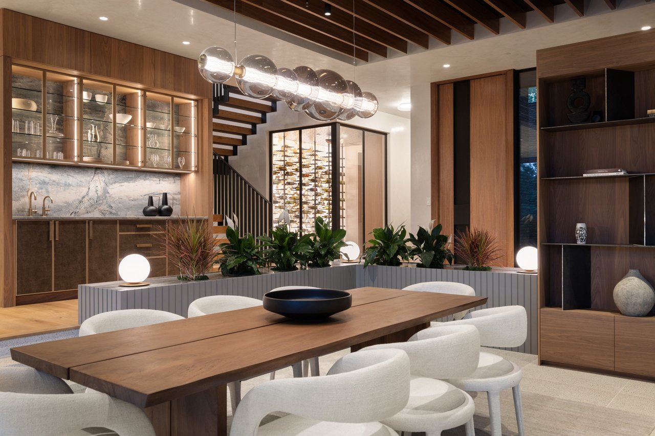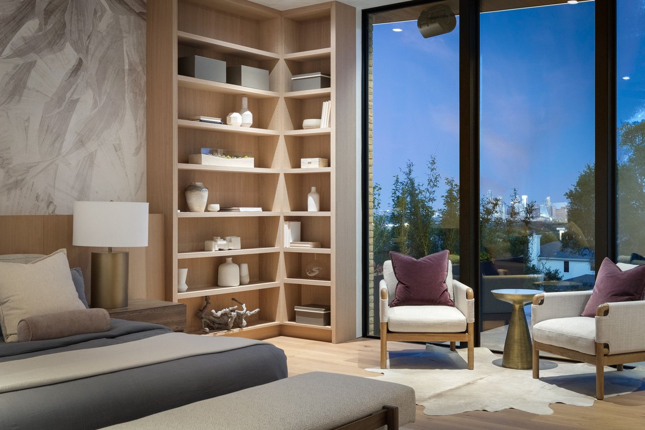 The open-concept living and kitchen spaces serve as the heart of the home, anchored by a dramatic, sculptural island inspired by the home’s distinctive roofline. Outfitted with Wolf and Sub-Zero appliances, including a steam oven and double dishwasher, the kitchen is complemented by a Santorini quartzite backsplash, Black Saratoga quartzite countertops, and a fully equipped walk-in pantry. A climate-controlled wine room with a backlit marble feature wall, along with an adjacent wet bar, further enhances the home’s entertaining capabilities. The residence offers 5 bedrooms, 7 full baths, and 2 half baths, with all bedrooms featuring en suite baths. A flexible layout includes five distinct living spaces: a main living room with a striking Inax ceramic tile fireplace, a sunken lounge, an office (or flex bedroom 2), game room, media room, and a wellness guest suite (or flex bedroom 7) complete with a sauna. The luxurious primary suite is a true retreat, offering sweeping Downtown views, spa-like finishes including plaster accents, heated floors, a bidet toilet, heated towel rack, and a spacious walk-in closet with a dedicated washer and dryer for added convenience.