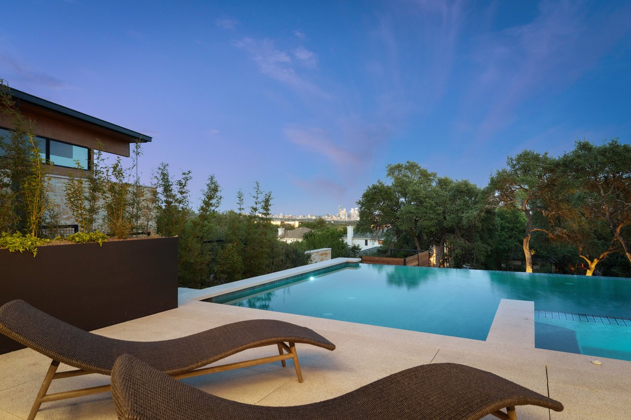 Seamless indoor-outdoor living unfolds with an infinity-edge pool overlooking the treetops and city skyline, complemented by a covered terrace and a fully equipped outdoor kitchen with grill, refrigerator, and ice maker. Built-in heaters, a floating patio floor with integrated drainage, a bamboo feature wall, and lush landscaping, including Carolina Jasmine and climbing hydrangeas, create a private, year-round outdoor experience. The home is equally suited for large-scale entertaining and everyday living, enhanced by high-end architectural detailing, extensive trim work, and fully integrated smart home technology. A Samsung SmartThings and Alexa ecosystem controls lighting, security, sound, and climate, with in-ceiling speakers throughout. A private guest suite with its own entrance provides ideal accommodations for visitors, while the wellness guest suite elevates the home’s livability with a gym space, sauna, steam shower, and cold plunge, creating a true at-home retreat. Upstairs, a game room with a kitchenette showcases seeded glass accents, while a separate media room opens to an additional covered terrace, offering sweeping views and a quiet escape. An attached two-car garage with extra-deep bays, along with five HVAC units servicing the home, ensures comfort and functionality at every level. Located within the highly acclaimed Eanes ISD, this exceptional residence delivers a rare combination of privacy, security, design, and close-in access to Downtown Austin and the Barton Creek Greenbelt.